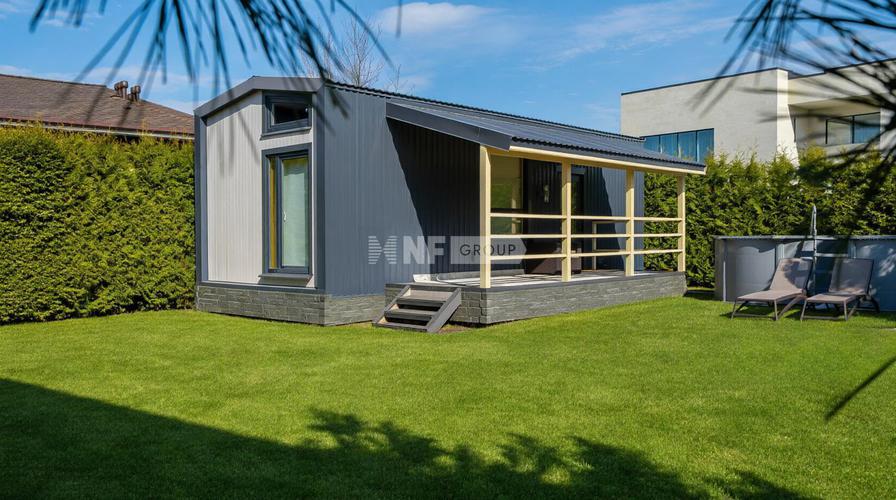1 этаж: гараж на одну машину в контуре дома. Гостевая спальня, санузел, гостиная объединена с кухонной зоной, второй свет, выход на открытую террасу;